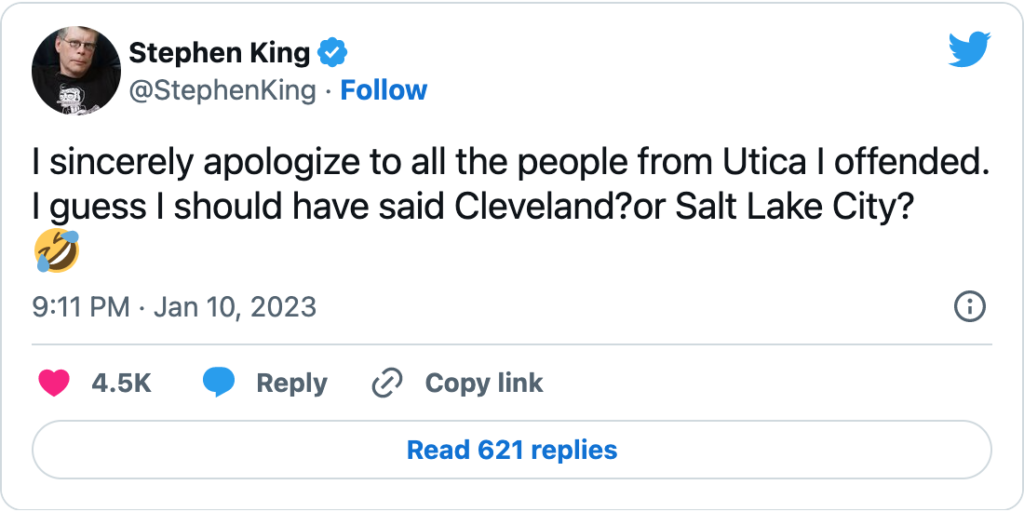 Rather than apologize and move on, King doubled down to throw his privileged hate at Cleveland, OH and Salt Lake City, UT furthering proof that he has little care for people who live in cities and are lower and middle class families. Even more disheartening, as he laughed about his bigotry more than 4.5K people ‘loved’ his hateful comments. Read more below.